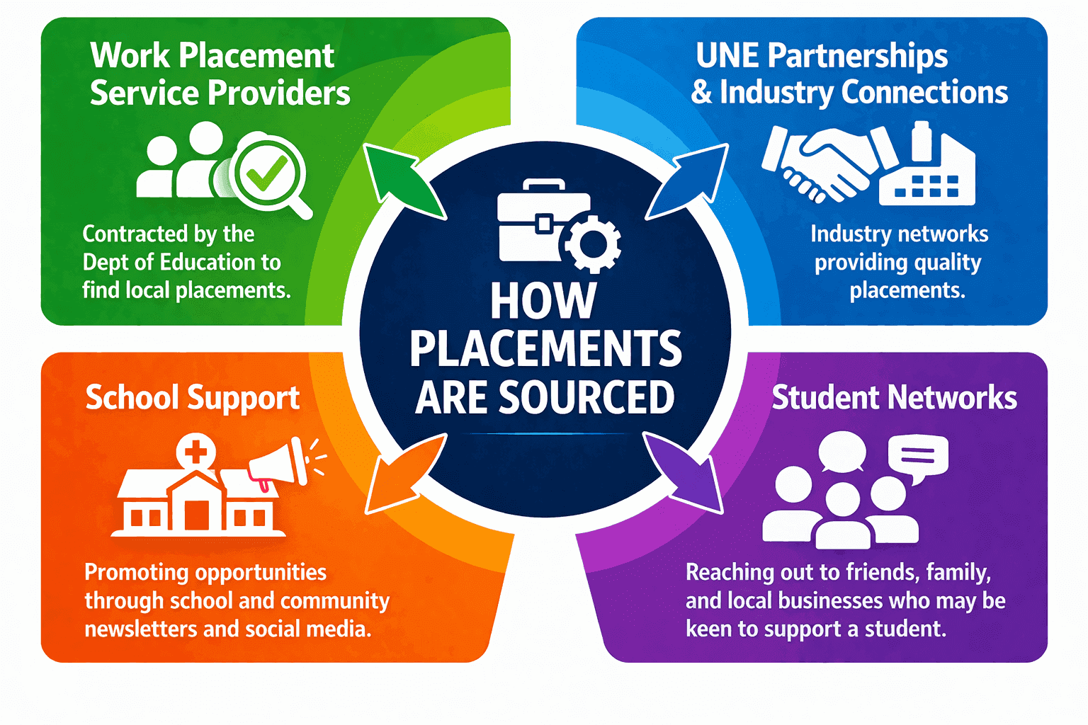 Finding a work placement isn’t something you have to do alone. With support from your area’s Work Placement Service Provider, UNE Partnerships and your school, plus your own initiative, you’ll be well placed to secure meaningful and rewarding experiences.